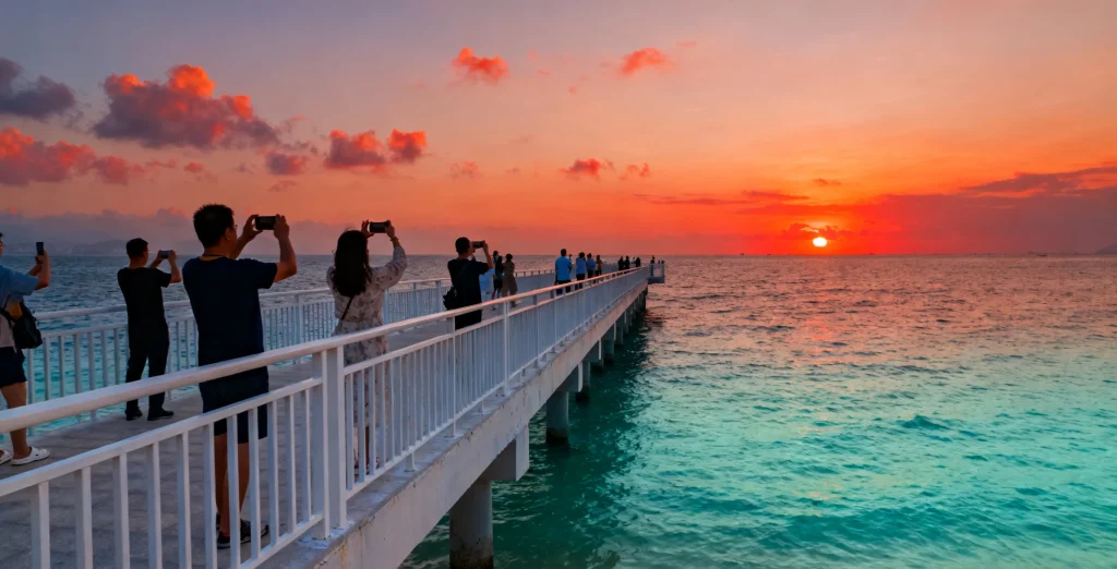 Early in the morning, head to the Wuzhizhou Island Pier and catch the first ferry to Wuzhizhou Island. With fewer visitors in the early hours, the island is especially beautiful—stop first at the Lovers’ Bridge to photograph romantic sea views, watching the clear water and distant boats moving slowly across the surface.
