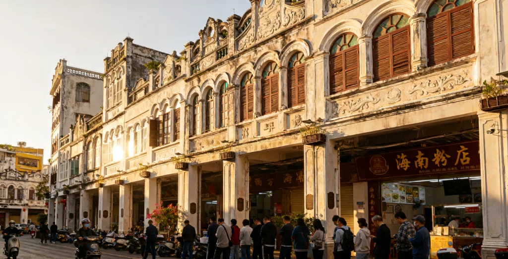 Arrive in Haikou in the early morning and head directly to your hotel near Qilou Old Street. After dropping your luggage, set off right away to catch Qilou Old Street in the quieter early hours: walk along Zhongshan Road and Shuixiangkou, see the relief arches and colorful window frames of the arcade buildings glowing warm in the morning light. Check in at an old-brand Hainan noodle shop at Shuixiangkou, order a hot bowl of dry-mixed Hainan rice noodles with a glass of iced salted lemon water to start your first Hainan taste experience. Step into an intangible cultural heritage exhibition hall inside the old street to admire coconut carving and Qiong opera costumes up close, and in the Huanhaige Art Space view Nanyang-style paintings in the morning light, feeling the quiet, artistic side of the old city.