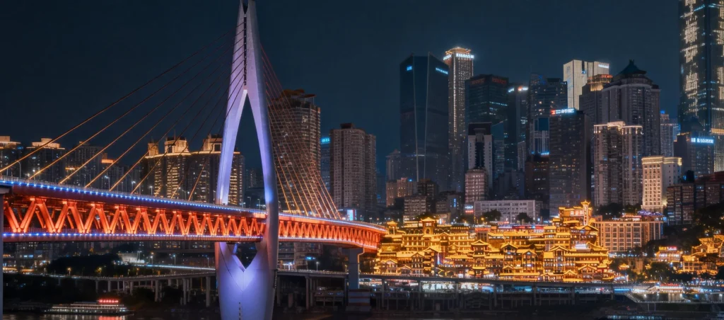Evening walk along Nanbin Road, capturing Chongqing’s dramatic night skyline