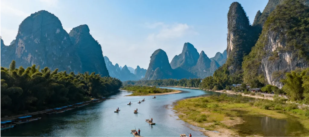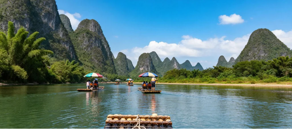 Bamboo rafting along the Li River (Yangdi to Xingping), passing classic karst scenery