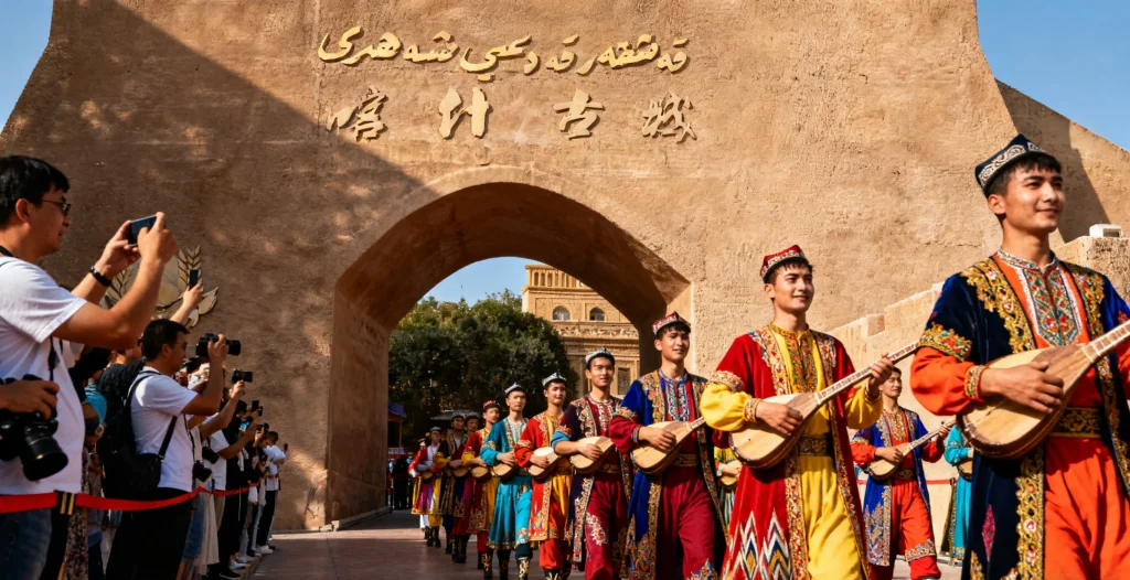 In the morning, take part in the Kashgar Old City opening ceremony, watching performers in traditional dress dance and play instruments, and feel the lively atmosphere of the ancient city. Then follow a local guide through the “handicraft street” of the old city to see Uyghur craftsmen making copperware and wood carvings, and try your hand at copper engraving.