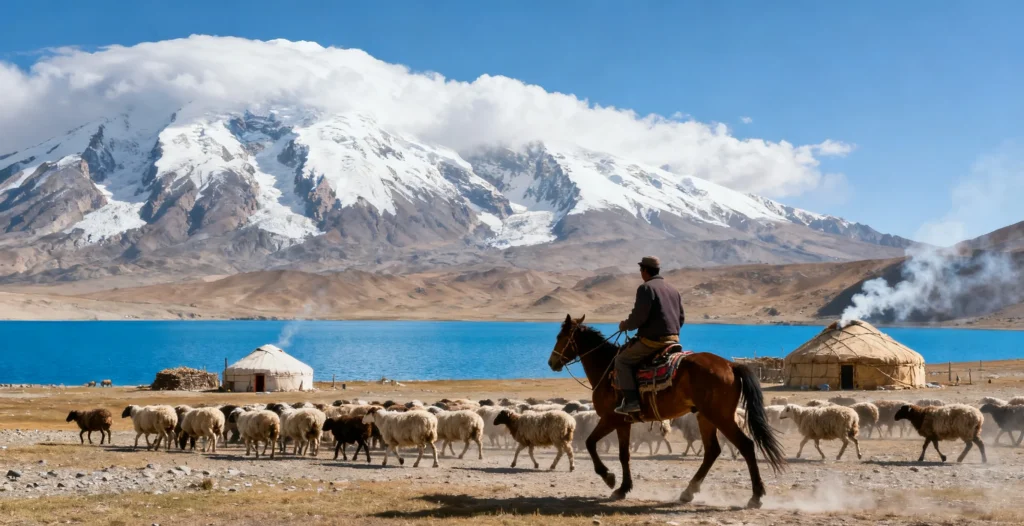 In the afternoon, arrive at Karakul Lake, where Muztagh Ata is reflected on the frozen lake surface—snow mountains, ice lake, and blue sky create a pristine picture. Experience horseback riding by the lakeside on the plateau and feel the majesty of the snow mountains up close.