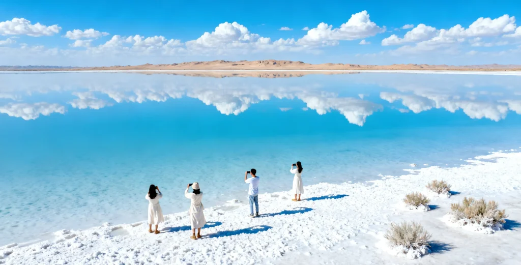 In the morning, drive to the Salt Lake, known as a “mirror of the sky.” Capture stunning photos where the lake surface reflects the blue sky and clouds in a surreal landscape.